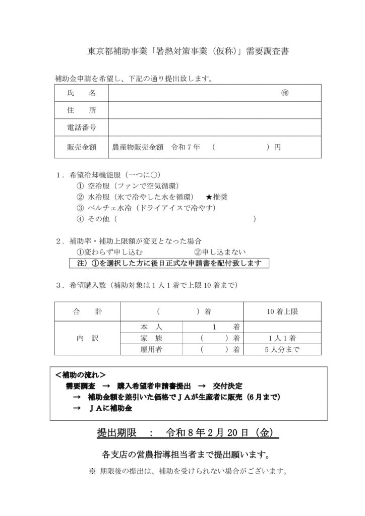 東京都補助事業として「暑熱対策事業」が実施されます。都内農業者の冷却服等の購入に対しての補助となります。内容については未確定な部分もございますが、冷却服等の購入に対しての補助となり、冷却服の購入需要調査を早急に行い概ねの需要量を報告することとなりました。つきましては、補助希望の方は下記の需要調査書を印刷してご記入いただき、令和8年2月20日(金)までにJAへ提出をお願いいたします。